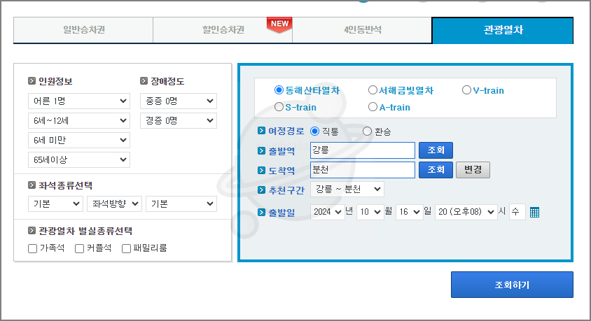 - 출발역과 도착역, 인원수, 좌석 종류 입력