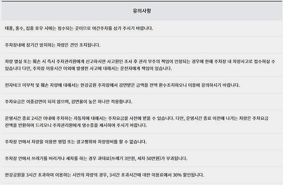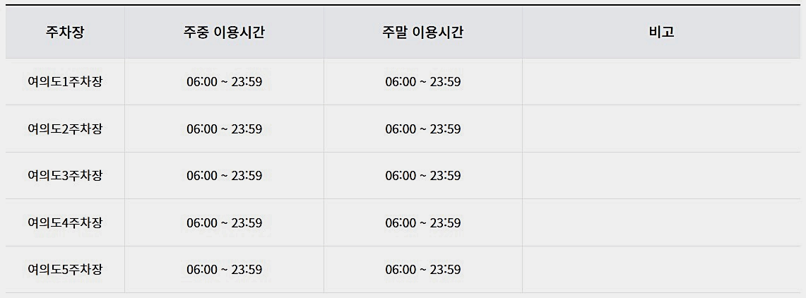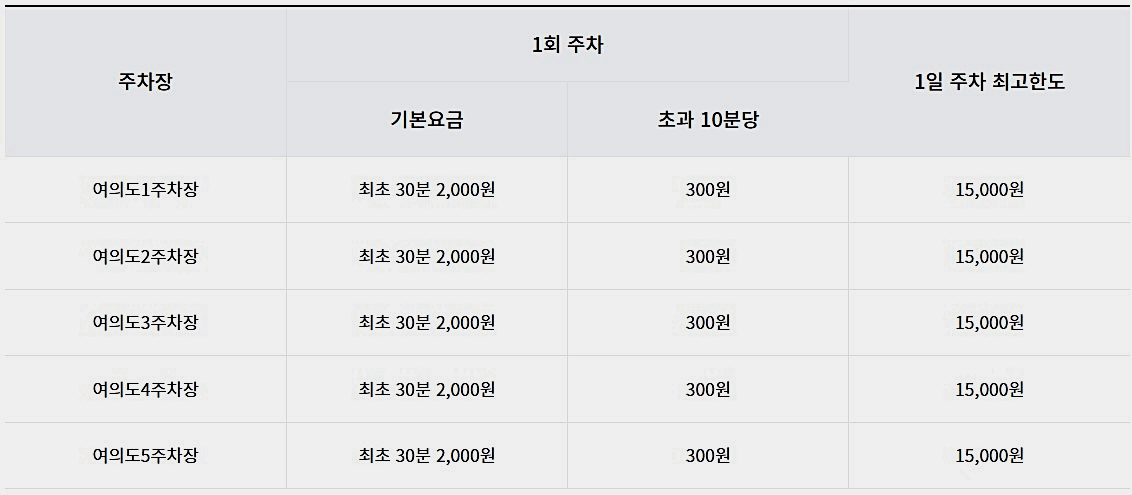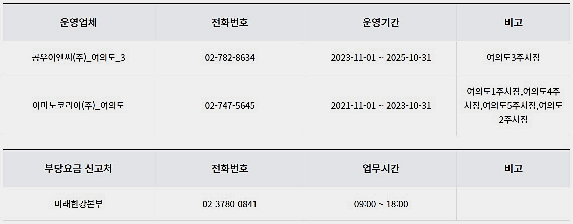 여의도 한강공원의 주차 가능 대수를 아래와 같이 표로 정리해드릴게요.