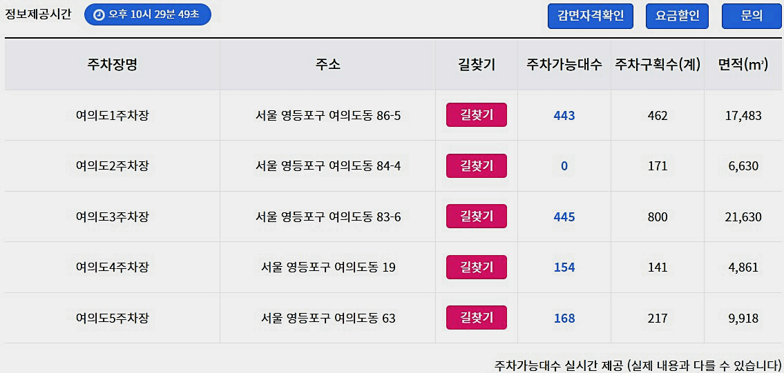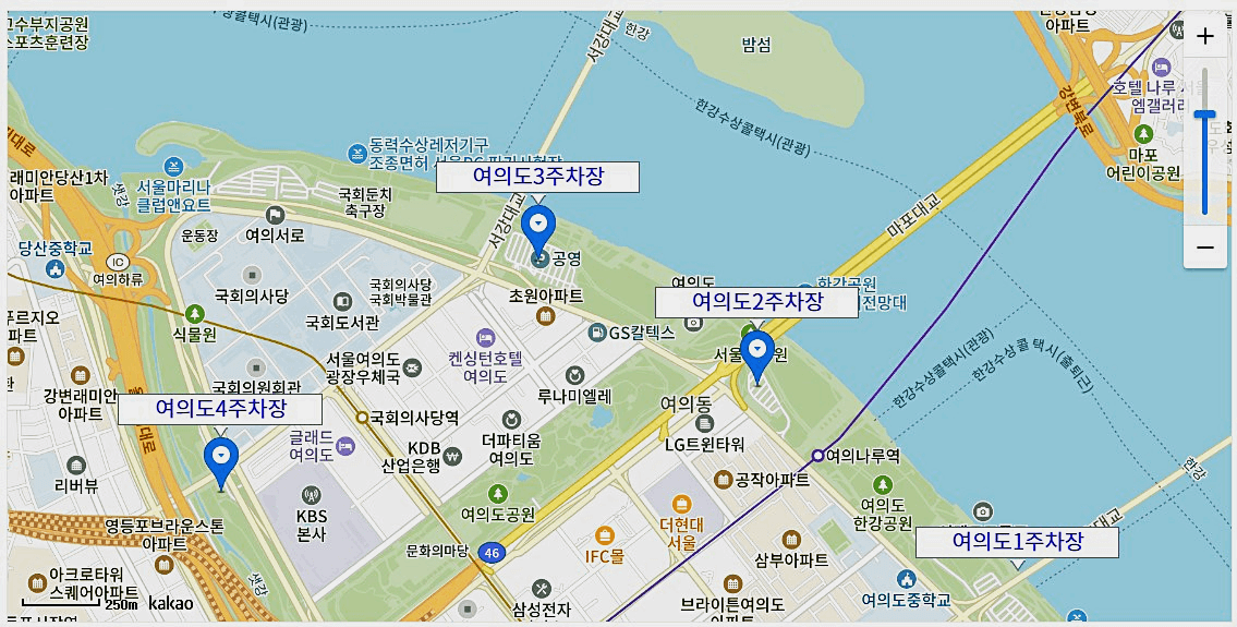 여의도 한강공원에는 총 5개의 주차장이 있으며, 이들 모두 24시간 운영됩니다. 주차 공간은 평소에는 여유가 있지만, 행사 시즌에는 빠르게 만차될 수 있으니 미리 주차 가능 대수를 확인하는 것이 좋습니다.