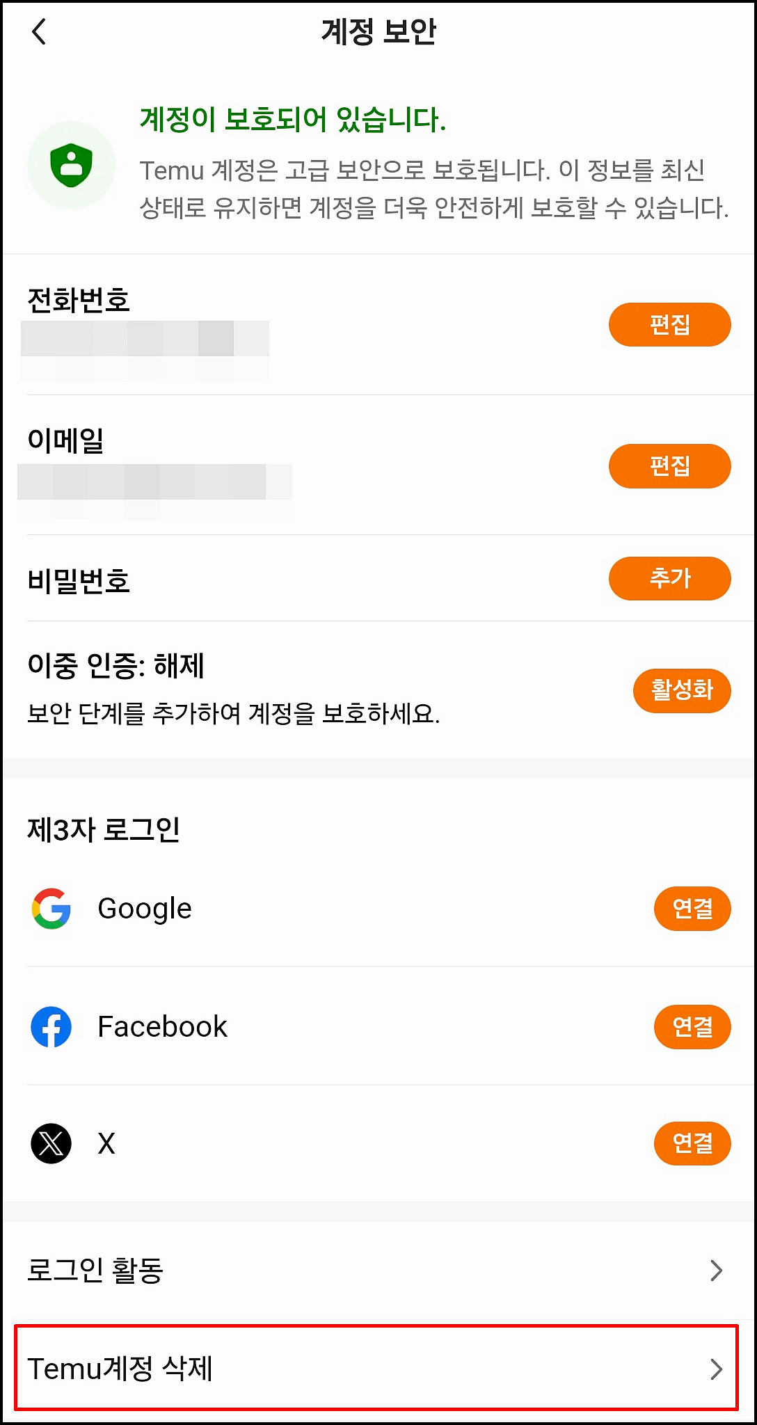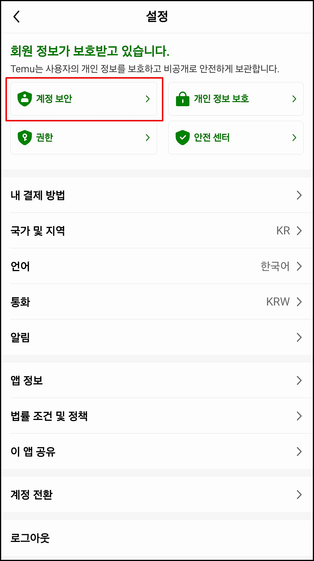 설정 메뉴에서 "계정 보안" 옵션을 찾아 클릭합니다. 여기서 'Temu 계정 삭제' 버튼을 찾을 수 있습니다.