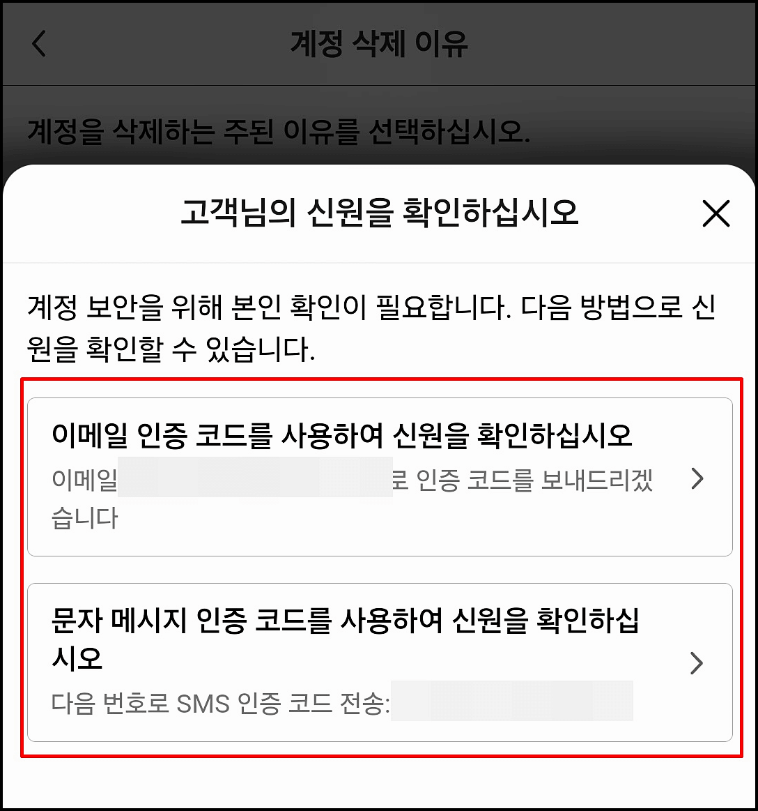 계정과 연결된 구글 계정이나 이메일을 통해 신원 확인 절차를 진행합니다. 확인이 완료되면 탈퇴 요청이 진행됩니다.