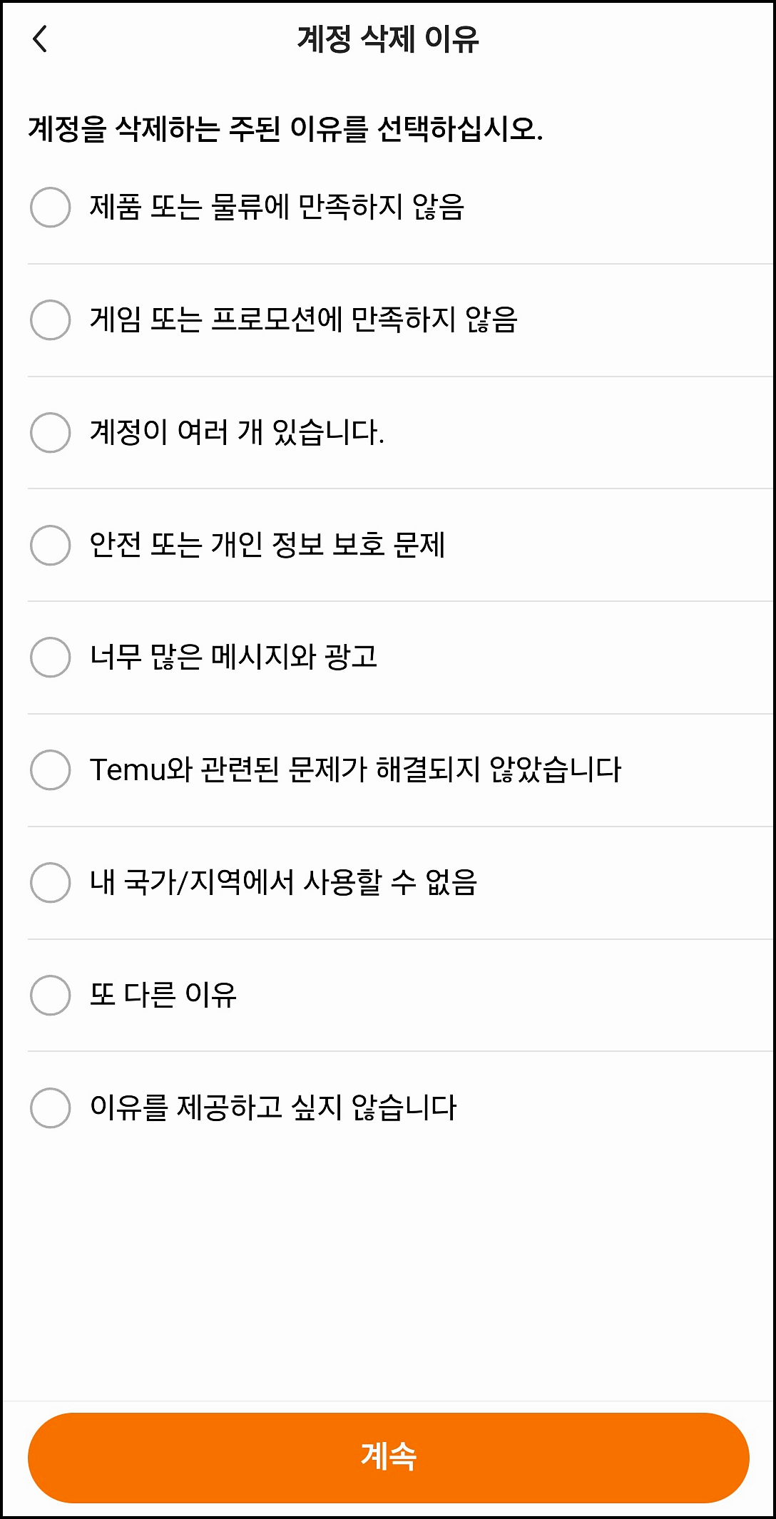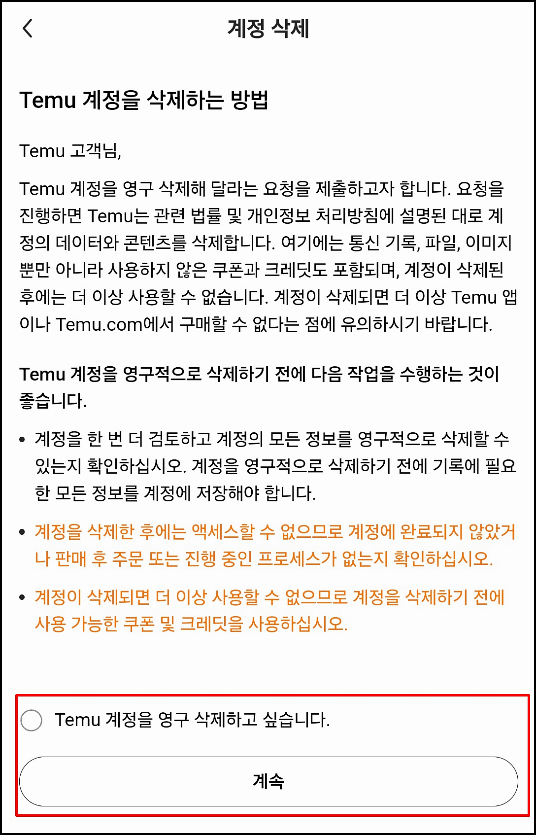계정 삭제 옵션을 선택하면 주의사항이 나타납니다. 'Temu 계정을 영구 삭제하고 싶습니다'에 체크한 후 계속 진행하세요.