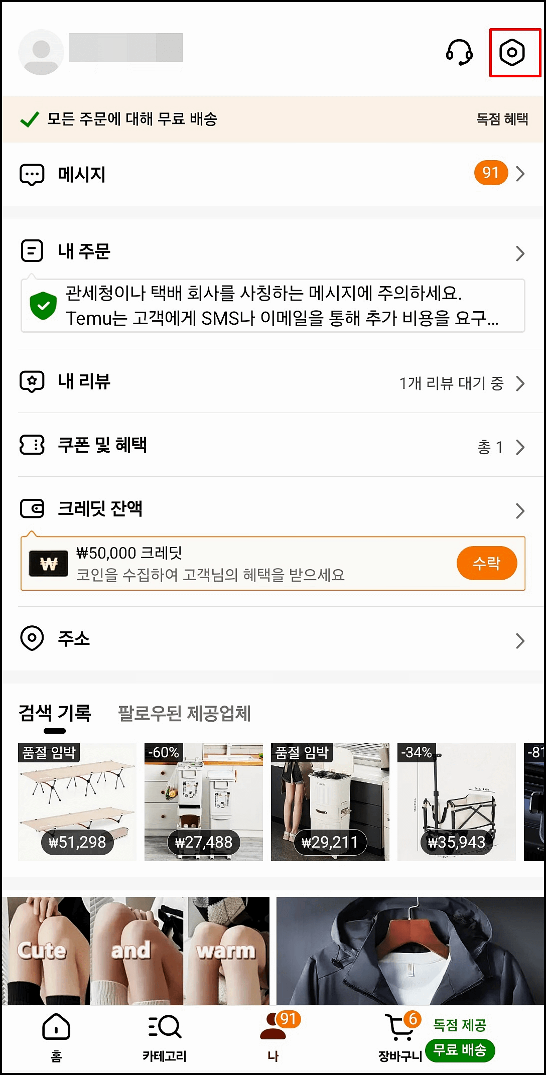 테무 앱을 실행한 뒤 하단 메뉴에서 '나' 버튼을 클릭하세요. 그러면 설정 화면으로 이동합니다.